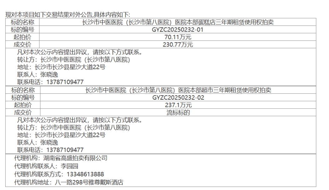 长沙市中医医院(长沙市第八医院)本部蛋糕店、超市租赁使用权第一次拍卖结果公告